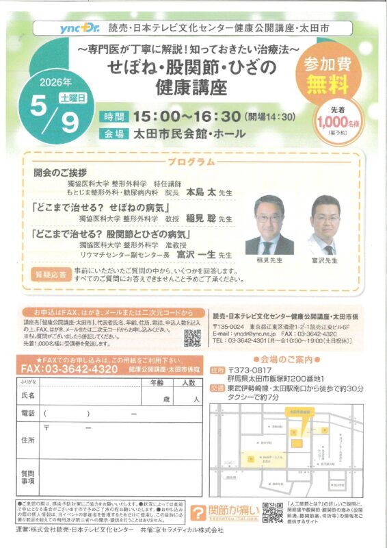 | 問合せ | 読売・日本テレビ文化センター健康公開講座・太田市係 Tel 03-3642-4301(月~金10:00~19:00) |