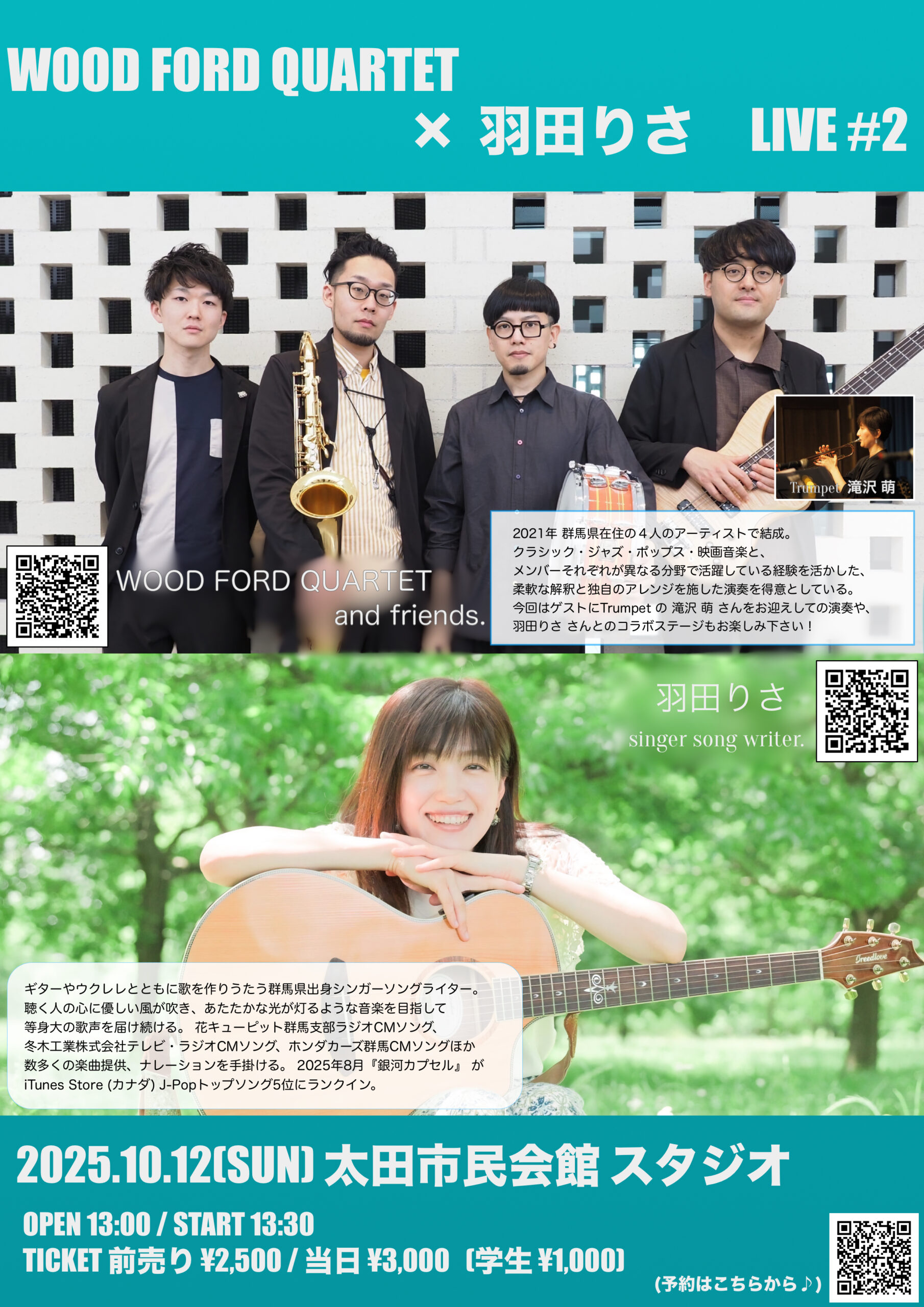 2025年10月12日のイベント 貸館情報 日時:2025年10月12日 WOOD FORD QUARTET 催事名 WOOD FORD QUARTET 日 時 2025年10月12日(日)開演... MORE