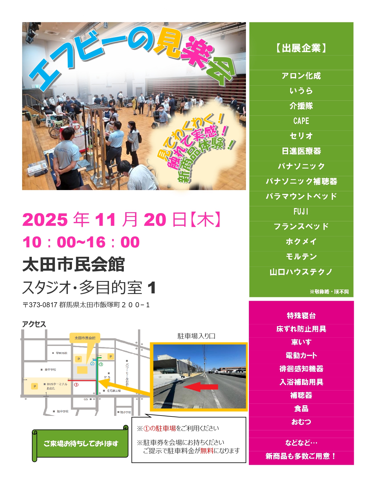 2025年11月20日のイベント 貸館情報 日時:2025年11月20日 エフビーの見学会 催事名 エフビーの見学会 日 時 2025年11月20日(木)10:00~16:00 会 場 太田市民... MORE