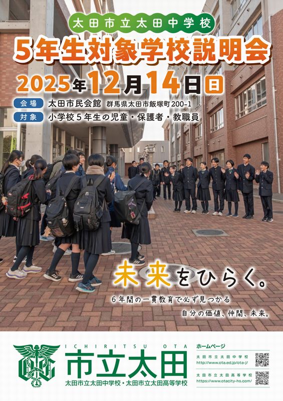 2025年12月14日のイベント 貸館情報 日時:2025年12月14日 太田市立太田中学校 5年生対象学校説明会 催事名 太田市立太田中学校 5年生対象学校説明会 日 時 令和7年12月14日... MORE