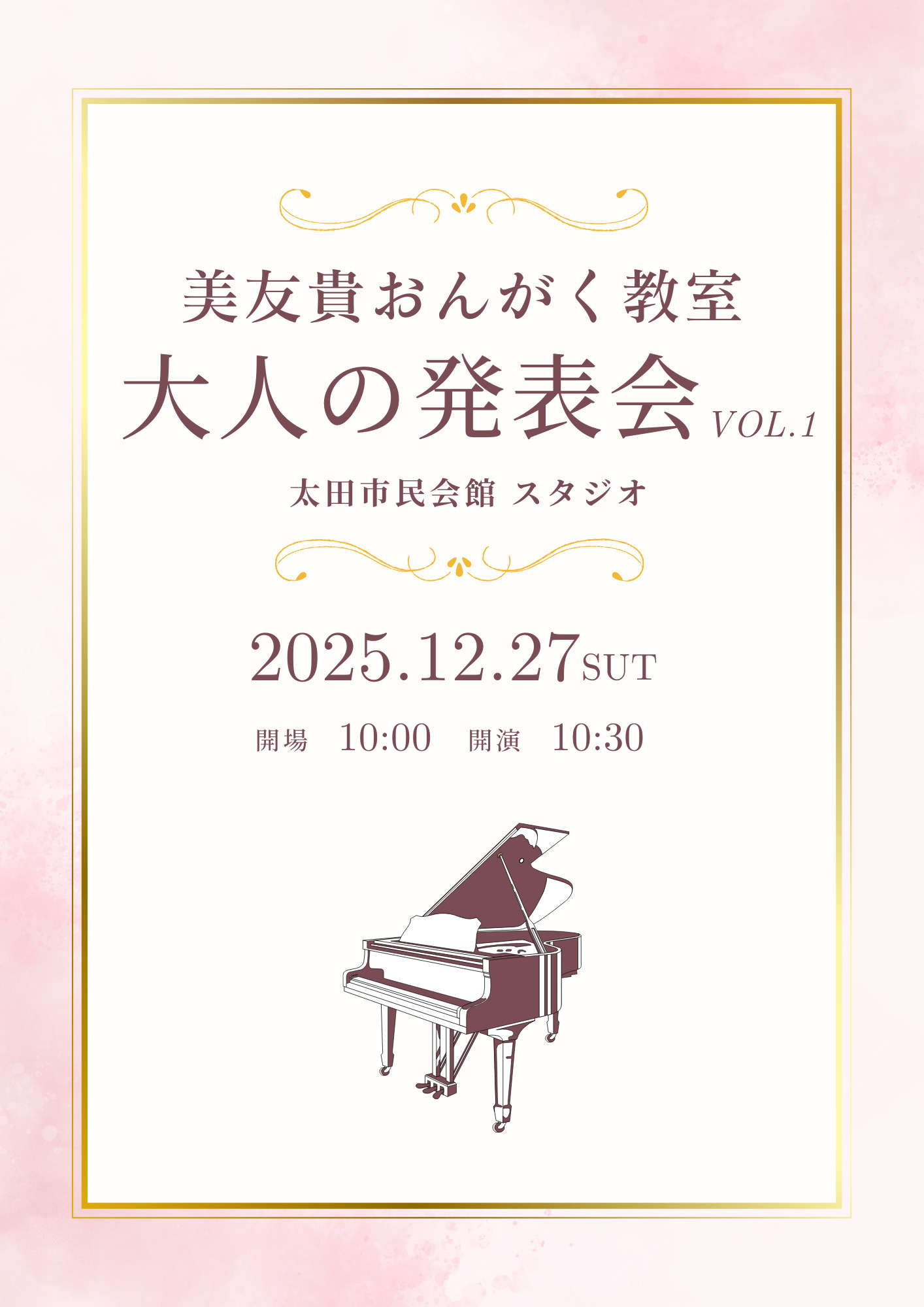 2025年12月27日のイベント 貸館情報 日時:2025年12月27日 美友貴おんがく教室 大人の発表会VOL.1 催事名 美友貴おんがく教室 大人の発表会VOL.1 日 時 令和7年12月2... MORE
