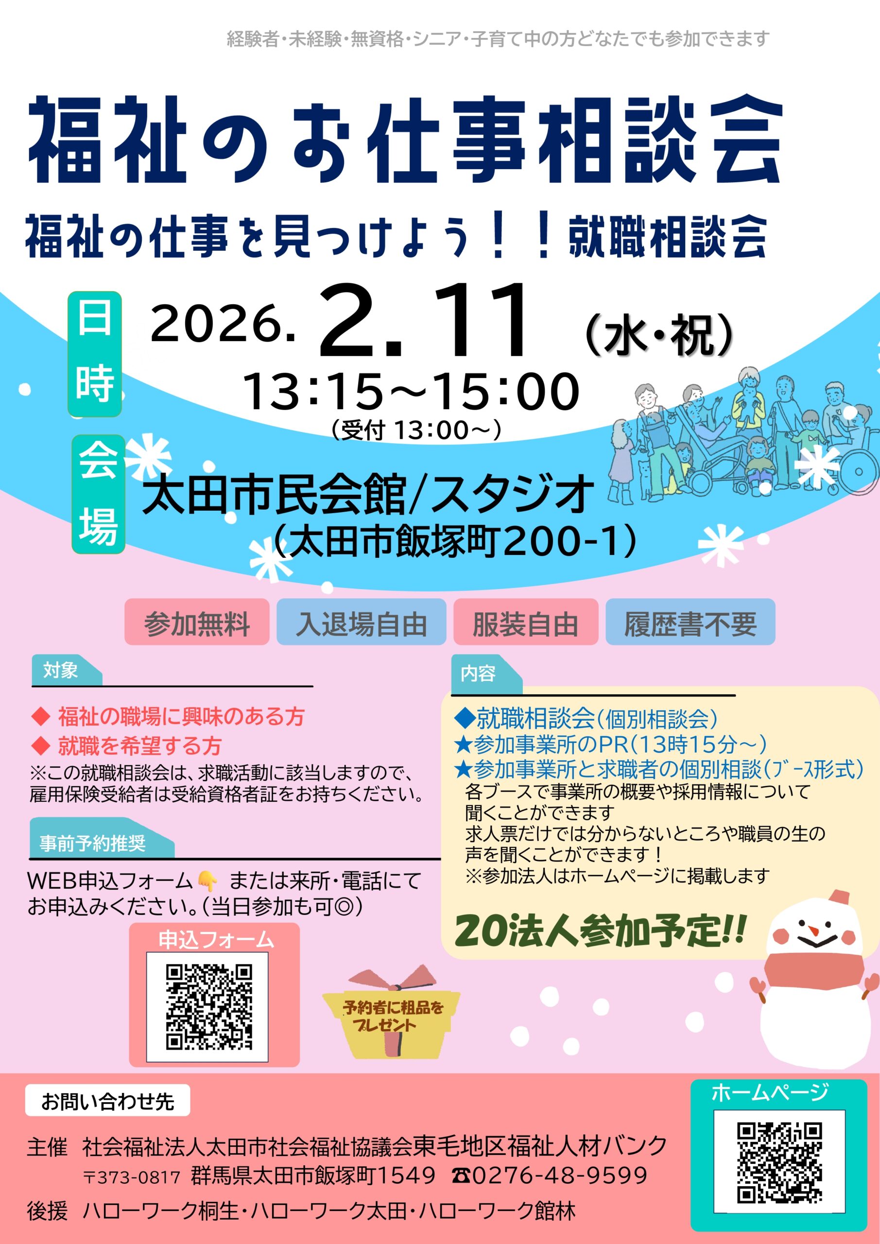 2026年2月11日のイベント 貸館情報 日時:2026年2月11日 福祉のお仕事相談会 催事名 福祉のお仕事相談会 日 時 令和8年2月11日(水)受付13:00/開場13:15 会 場 ... MORE