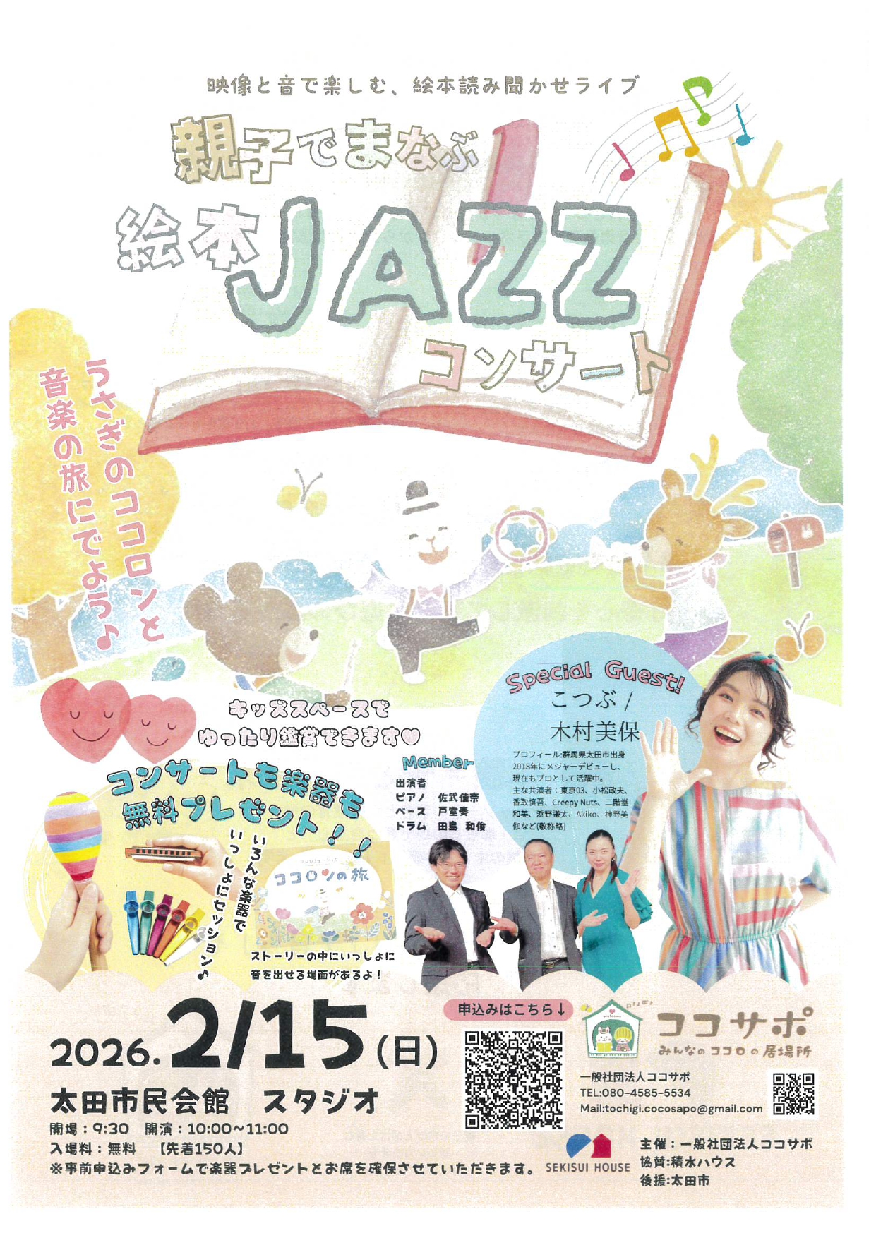 2026年2月15日のイベント 貸館情報 日時:2026年2月15日 親子でまなぶ絵本JAZZコンサート 催事名 親子でまなぶ絵本JAZZコンサート 日 時 令和8年2月15日(日) 開 場... MORE